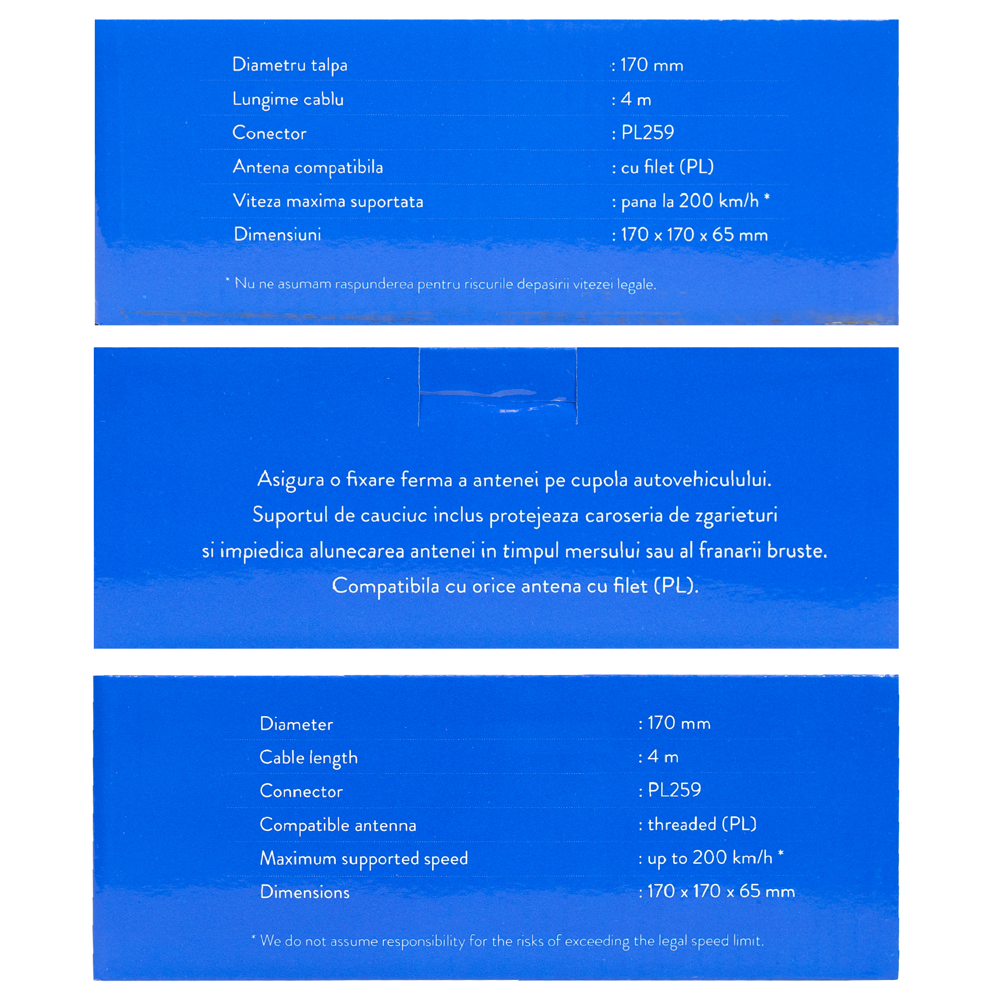 Magnetfuß (Ø 35mm) mit enormer Haftkraft. Am 2,40m verlustarmen RG 174 Anschlusskabel ist ein TNC-Stecker montiert.